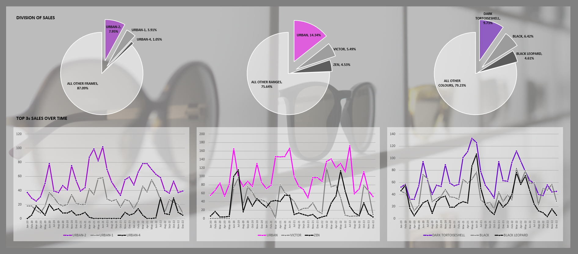Highlighting the top selling frames, ranges and colours, with their top tens.