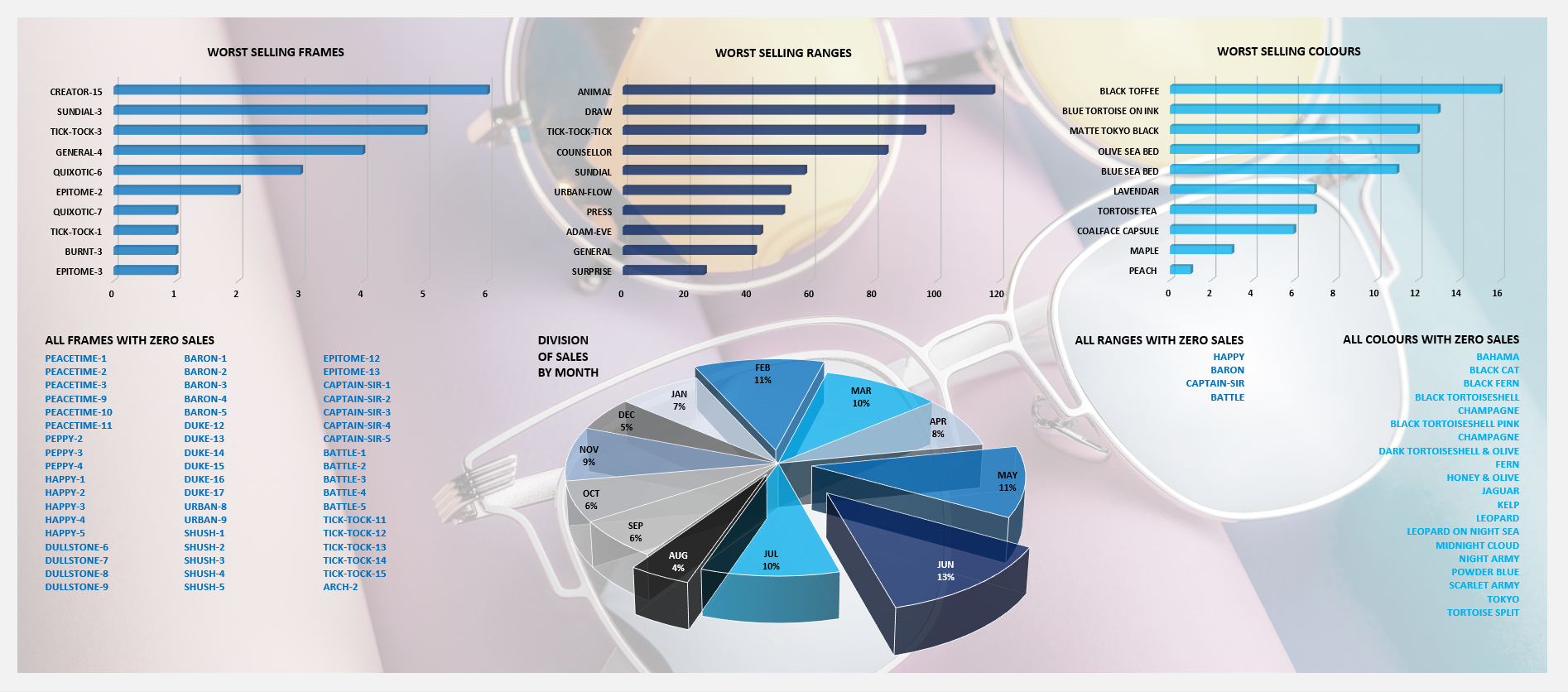 Identifying the worst selling frames, ranges and colours, as well as those with zero sales.