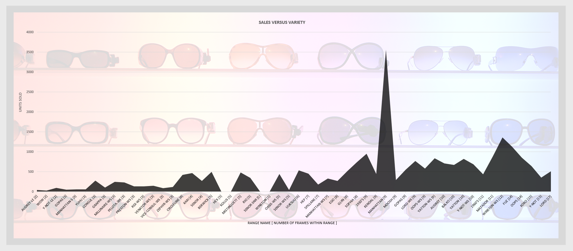 Looking at all the data I concluded that there were too many unnecessary frames and ranges, some of which were selling badly and some not selling any units at all. It was very clear to me from all the charts that the real workhorses of the brand were just a few frames and one particular range. These accounted for the vast majority of sales. There was also a clear indication that black and darker colours sold best, by a large margin.