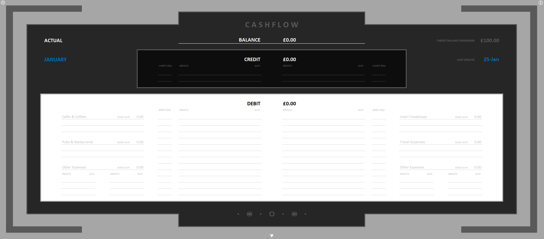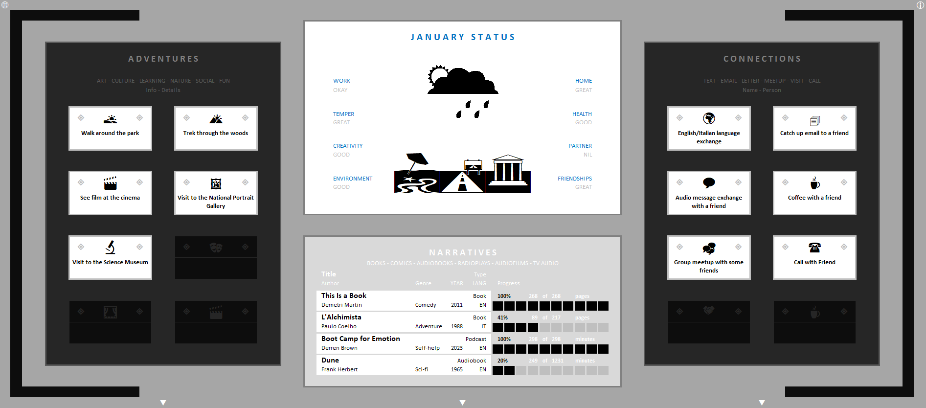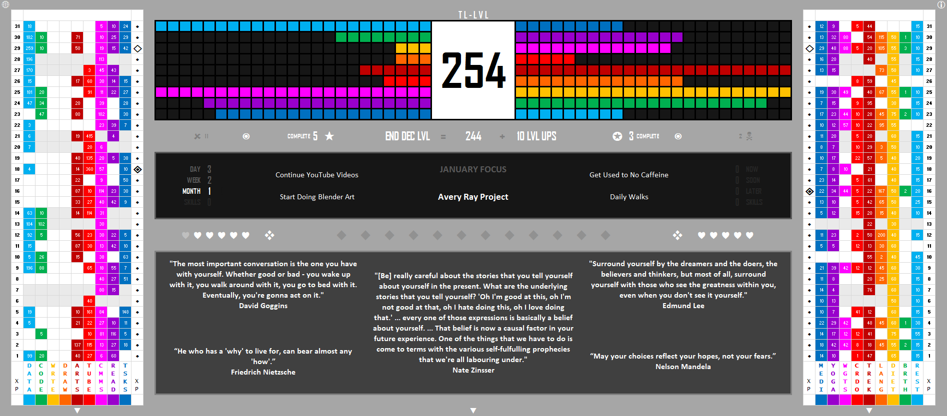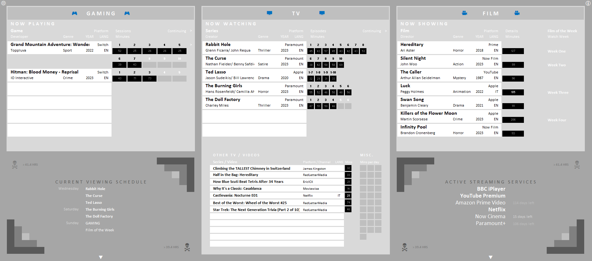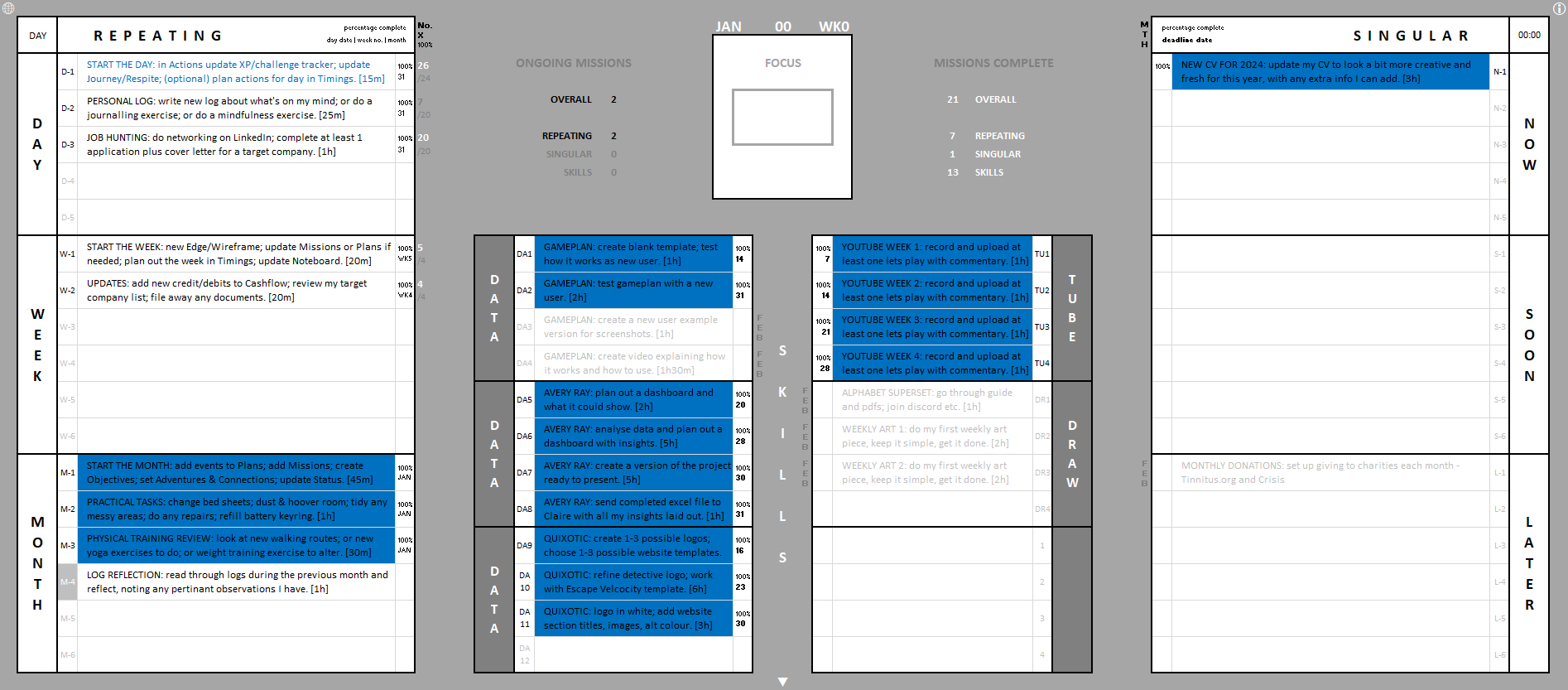 There are a total of sixteen sheets that form the Gameplan workbook. For each sheet, scrolling down reveals additional areas and functions. Shown below is an example month from my own use of the Gameplan as a test subject. The example month is January 2024. Note that the theme colour for each month is dynamic. Some data has been adjusted for privacy reasons.