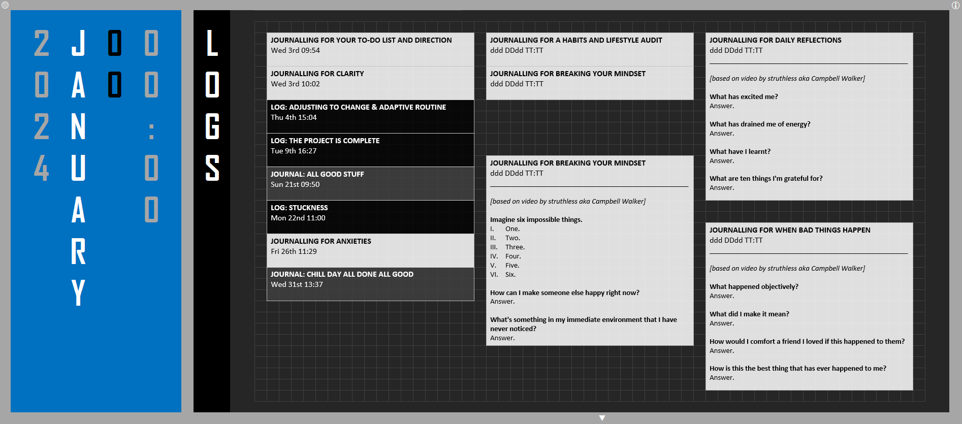 LOGS: Where the player can write logs with thoughts on anything and everything, or follow journalling prompt questions or exercises. There is a space for writing out logs within text boxes or to make note of where to find handwritten journals or audiologs.