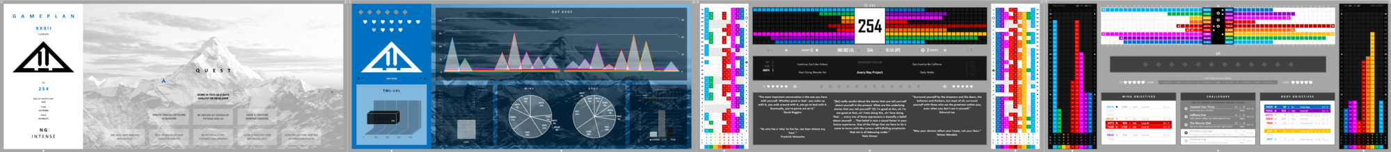 ACTIONS: This is the core of the gameplan, where all XP (experience points) for actions done is entered. It works as a hub for seeing vital info about the gameplan and current goals, with some inspiring quotes showing to help the player feel positive and motivated.